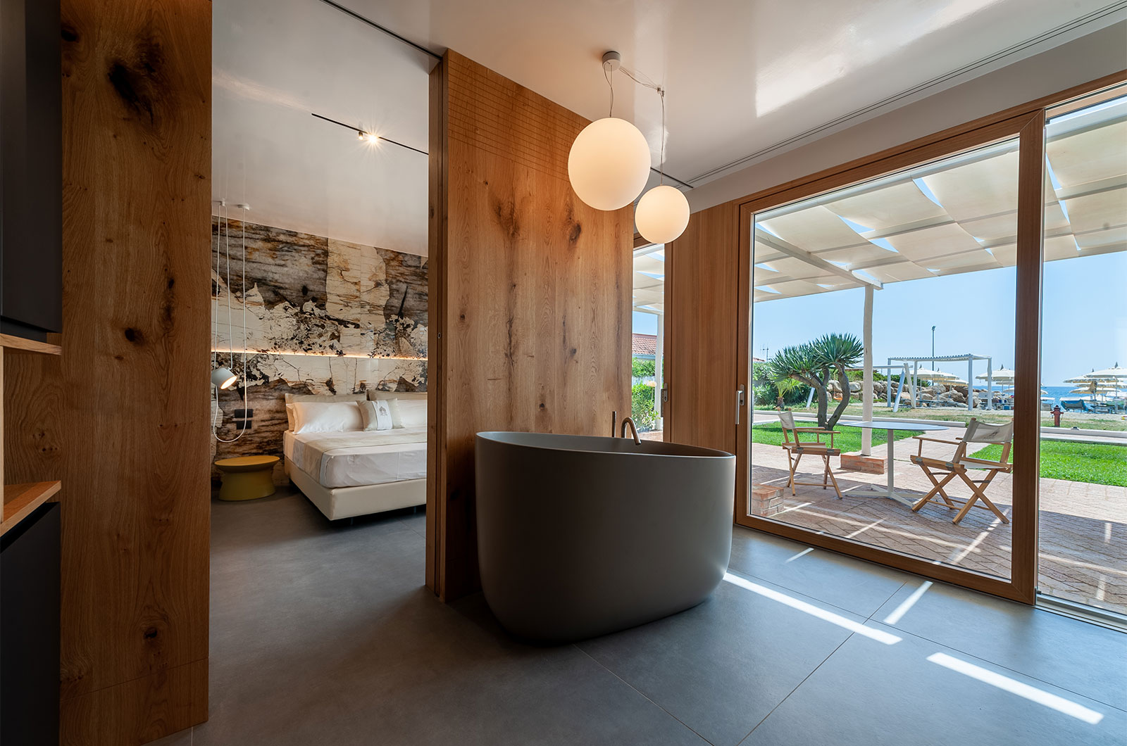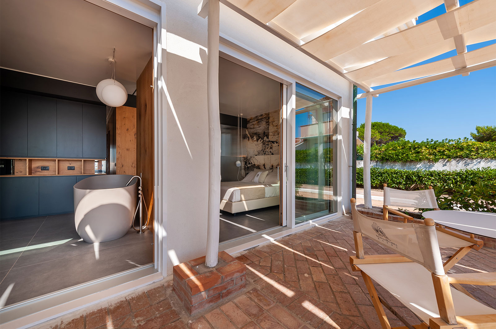 Fiore all’occhiello di questa suite non convenzionale è sicuramente la vasca da bagno “ofuro” stile giapponese, collocata nella zona living, quasi a completare il salottino, da cui potrete godere della vista del mare immersi nell’acqua magari sorseggiando del buon vino. In sostanza avrete a disposizione 40 mq sapientemente distribuiti tra un ampio bagno con doccia king size, due lavabi, bidet, wc e mobile con ante e ripiani; un doppio ambiente camera matrimoniale\living all’occorrenza divisibile mediante porte scorrevoli a tutta altezza per garantire la privacy; un vestibolo di ingresso con armadio bifacciale a quattro ante completamente attrezzato. Inoltre potrete godere di un doppio patio privato, arredato ed ombreggiato, a due passi dal mare. La suite è dotata di tutti i comfort e servizi tra cui: Smart TV da 50 pollici con servizi Sky, aria climatizzata, free wi-fi, cassaforte, frigobar, asciugacapelli, telefono, servizio in camera.