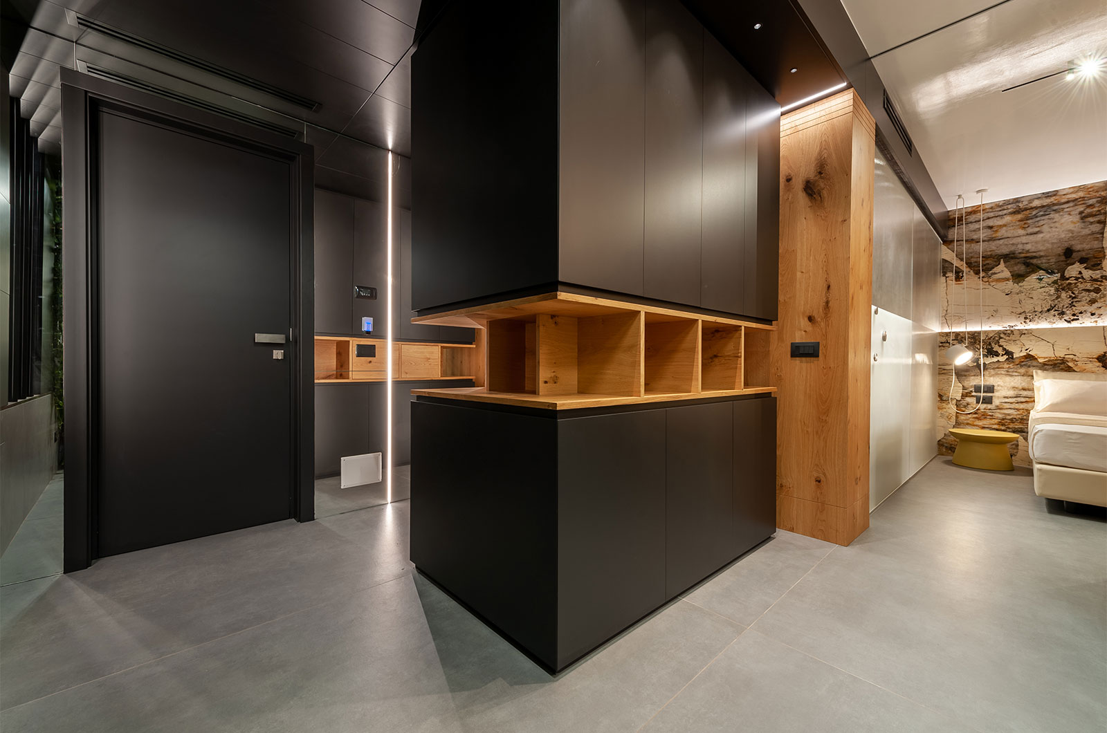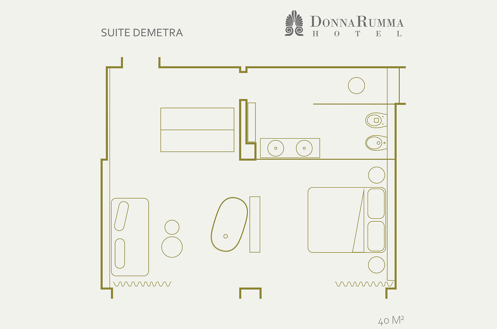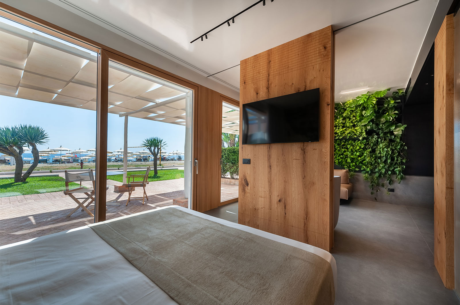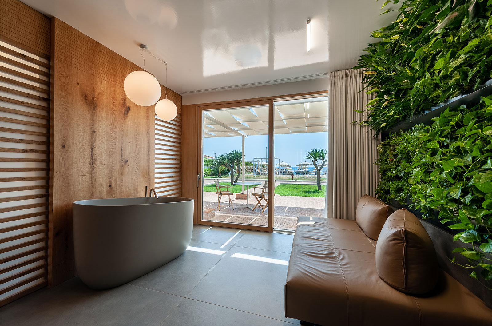 Addormentarsi cullati dal rumore del mare a due passi, svegliarsi aprendo gli occhi sull’azzurro infinito al di là del patio e sul verde confortante del giardino verticale del living, fanno del soggiorno nella suite DEMETRA un’esperienza indimenticabile. Il nome DEMETRA, “Madre Terra”, è la sintesi perfetta dell’anima della suite in cui ogni dettaglio è un chiaro rimando alla natura: dai pregiati rivestimenti in quarzite Patagonia, all’uso del legno, alla parete di verde verticale, in una continuità tra il “fuori” e il “dentro” accentuata dalle ampie vetrate scorrevoli sul patio fronte mare.